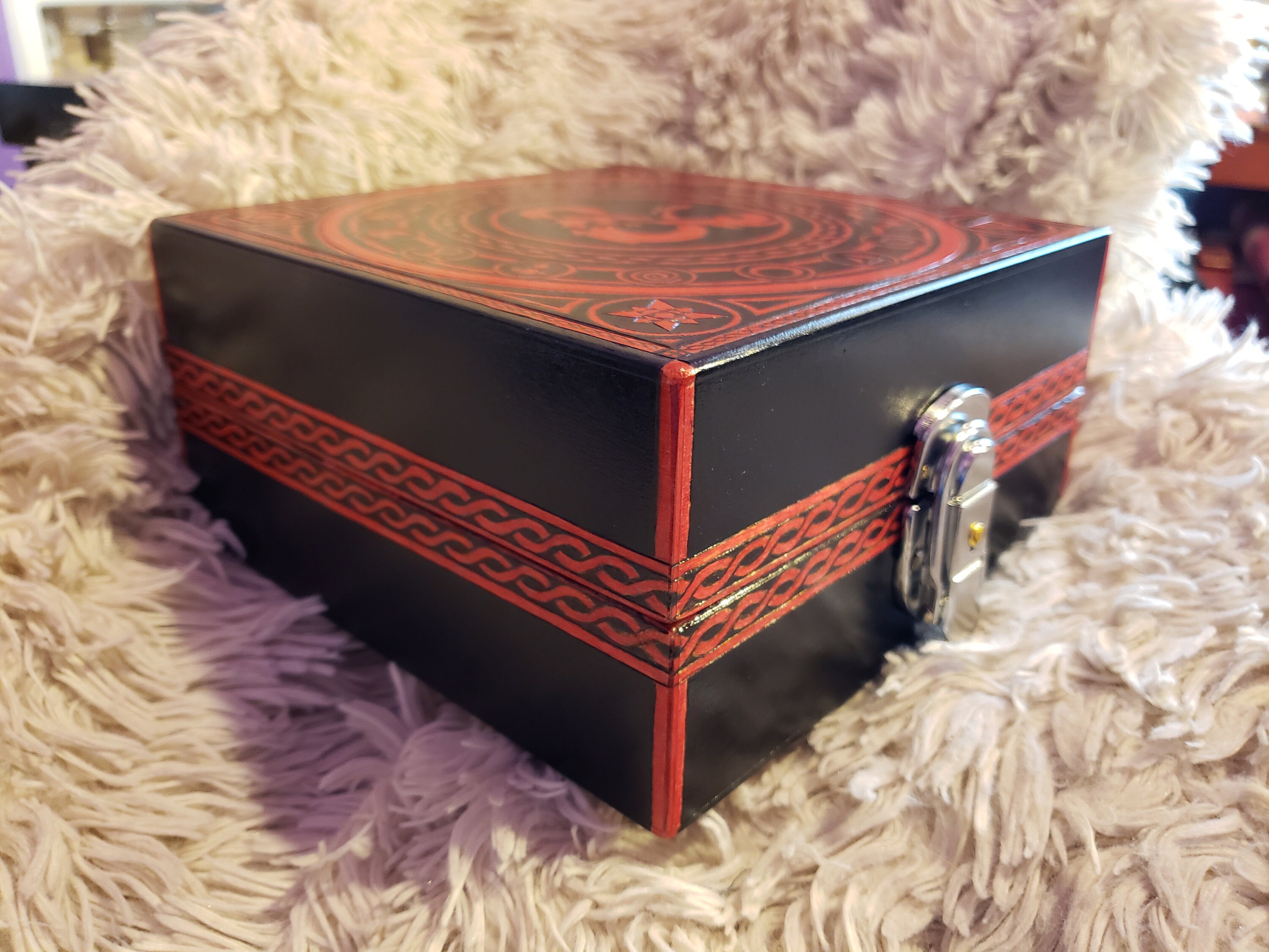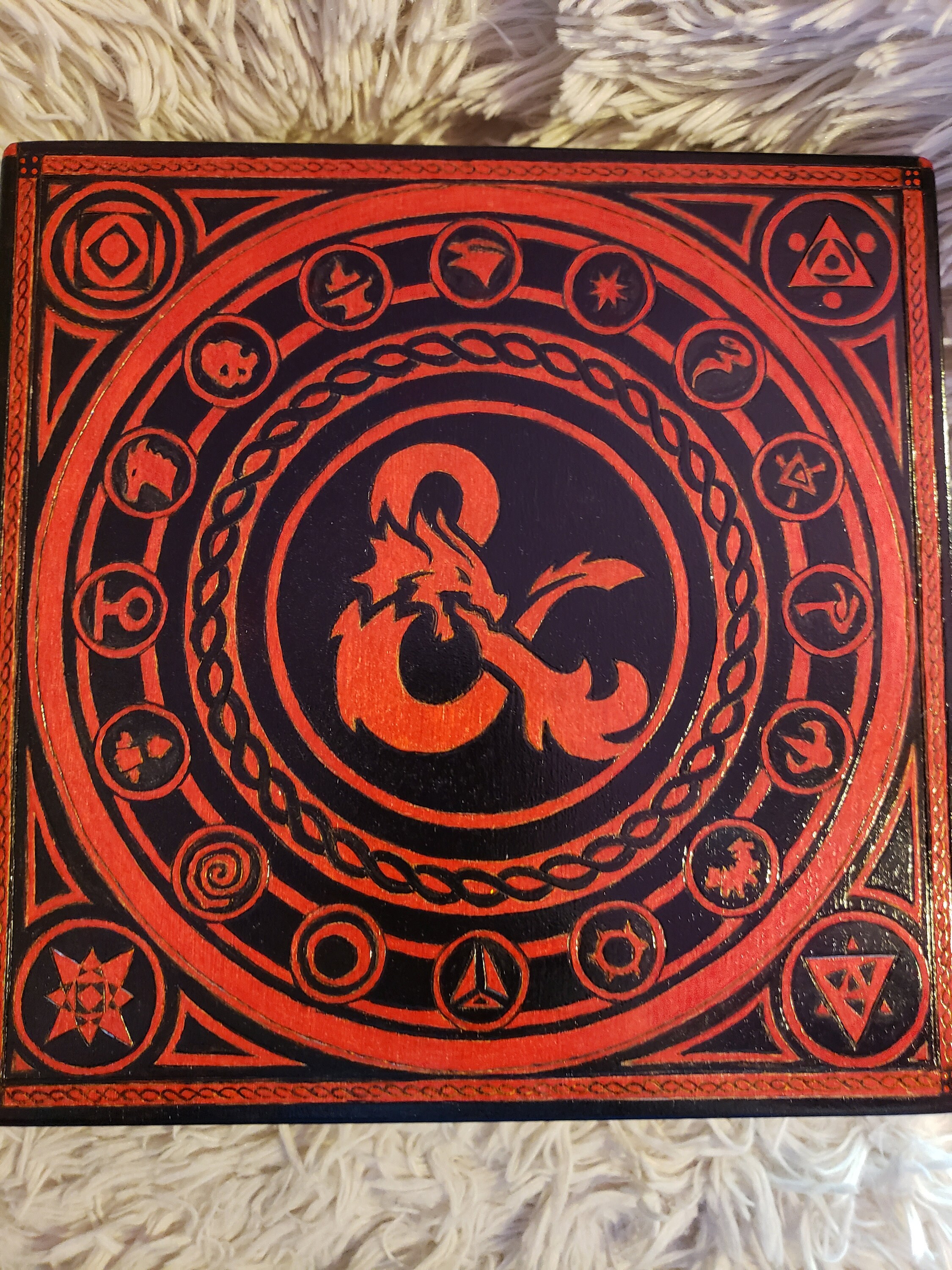 The outside of the box is decorated through use of pyrography ("fire writing"), color pensil and acrylic paint. While a double chain encircles all sides, the top is adorned with a design that incorporates 16 D n D gods, 4 alignments, as well as the iconic Dungeons & Dragons ampersand.