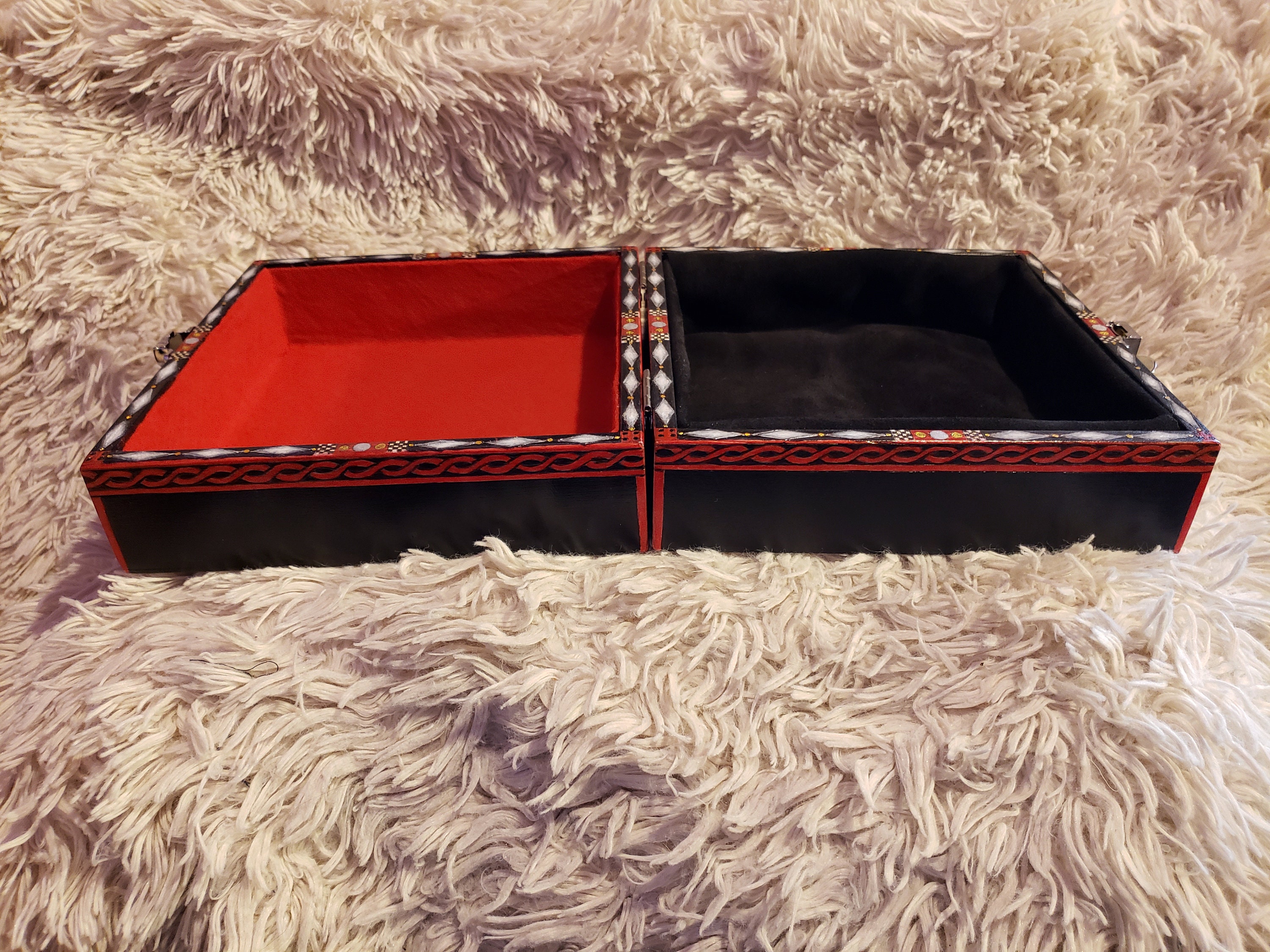 The unique feature of this box is the top opens and lays flush with the bottom so the top may be used to roll dice during play. The bottom is cushioned and lined in black suede. The top is lined in red felt for easy rolling.